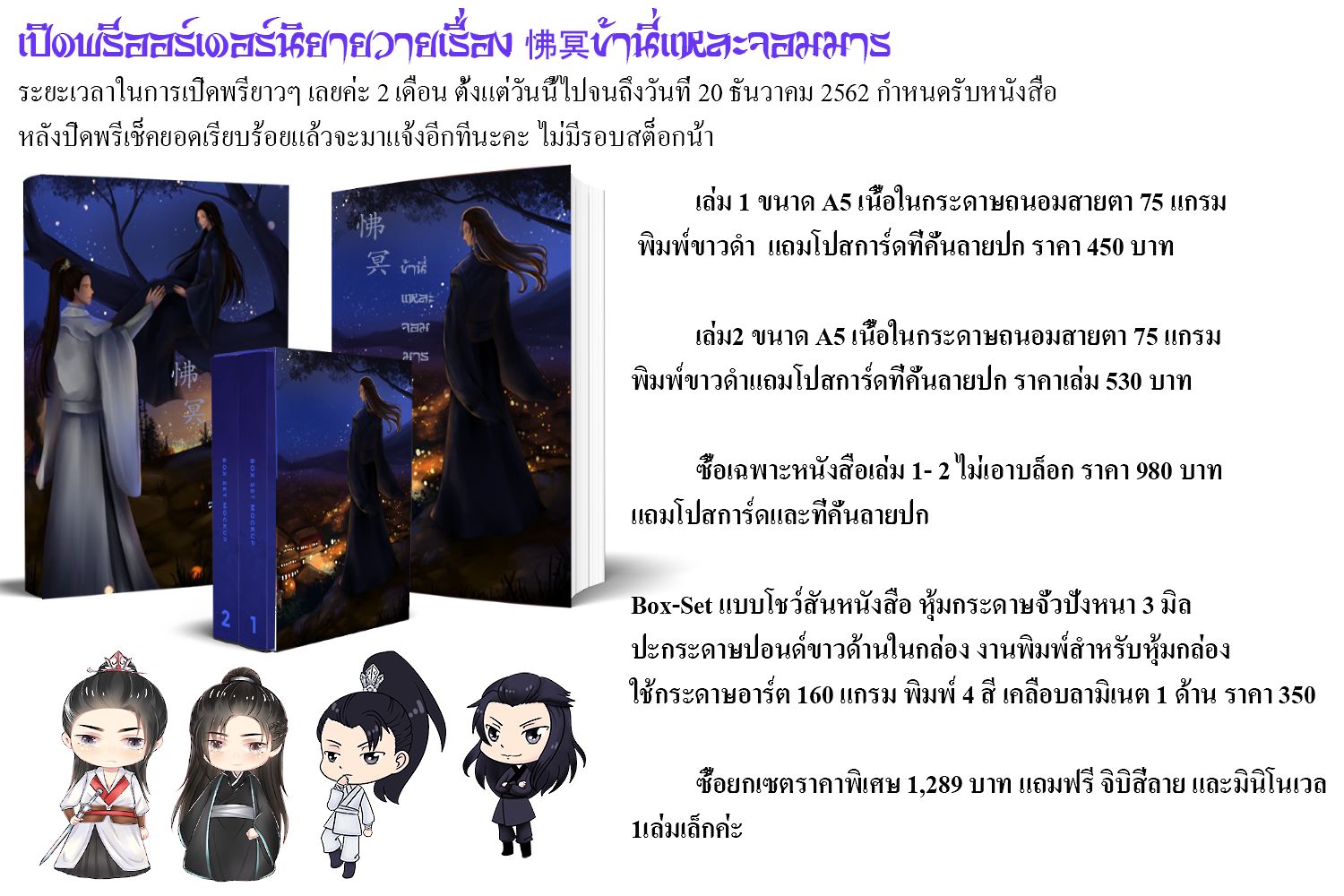 พรีออร์เดอร์นิยายวายเรื่อง 怫冥ข้านี่แหละจอมมาร สักที จำนวนสองเล่ม ระยะเวลาในการเปิดพรียาวๆ เลยค่ะ 2 เดือน ตั้งแต่วันนี้ไปจนถึงวันที่ 20 ธันวาคม 2562 กำหนดรับหนังสือหลังปิดพรีเช็คยอดเรียบร้อยแล้วจะมาแจ้งอีกทีนะคะ เพราะปิดพรีแล้วเจียวจะส่งเข้าโรงพิมพ์เลยทันที ไม่มีรอบสต็อกน้า ย้ำนะคะไม่มีรอบสต็อก