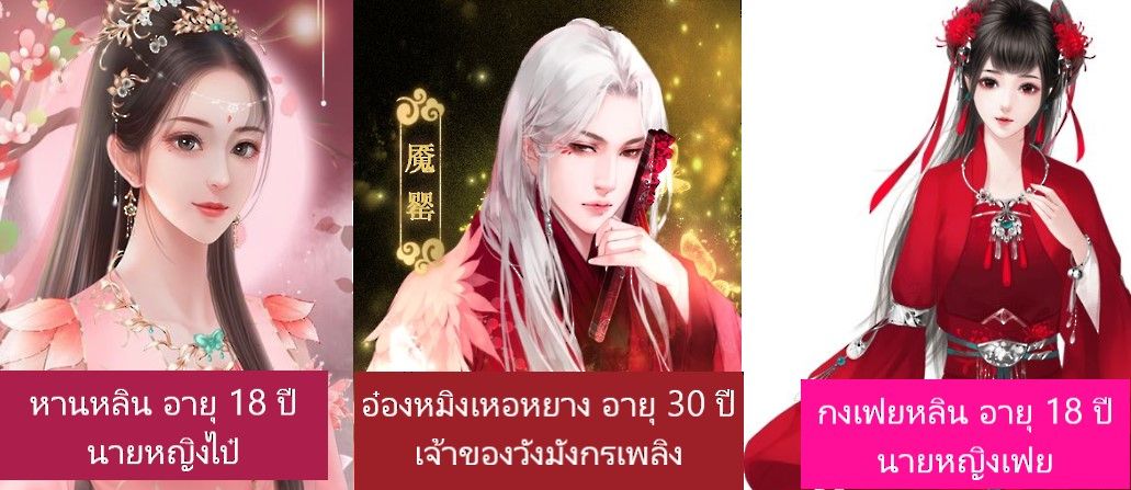 อ๋องหมิงเหอหยาง อายุ 30 ปี เจ้าของวังมังกรเพลิง แคว้นหมิง (เทพสงครามซีหมิง เมืองสวรรค์) : บุรุษผู้มีใบหน้างดงามราวเทพเซียน ผมสีเงินยวง ริมฝีปากแดงระเรื่อ