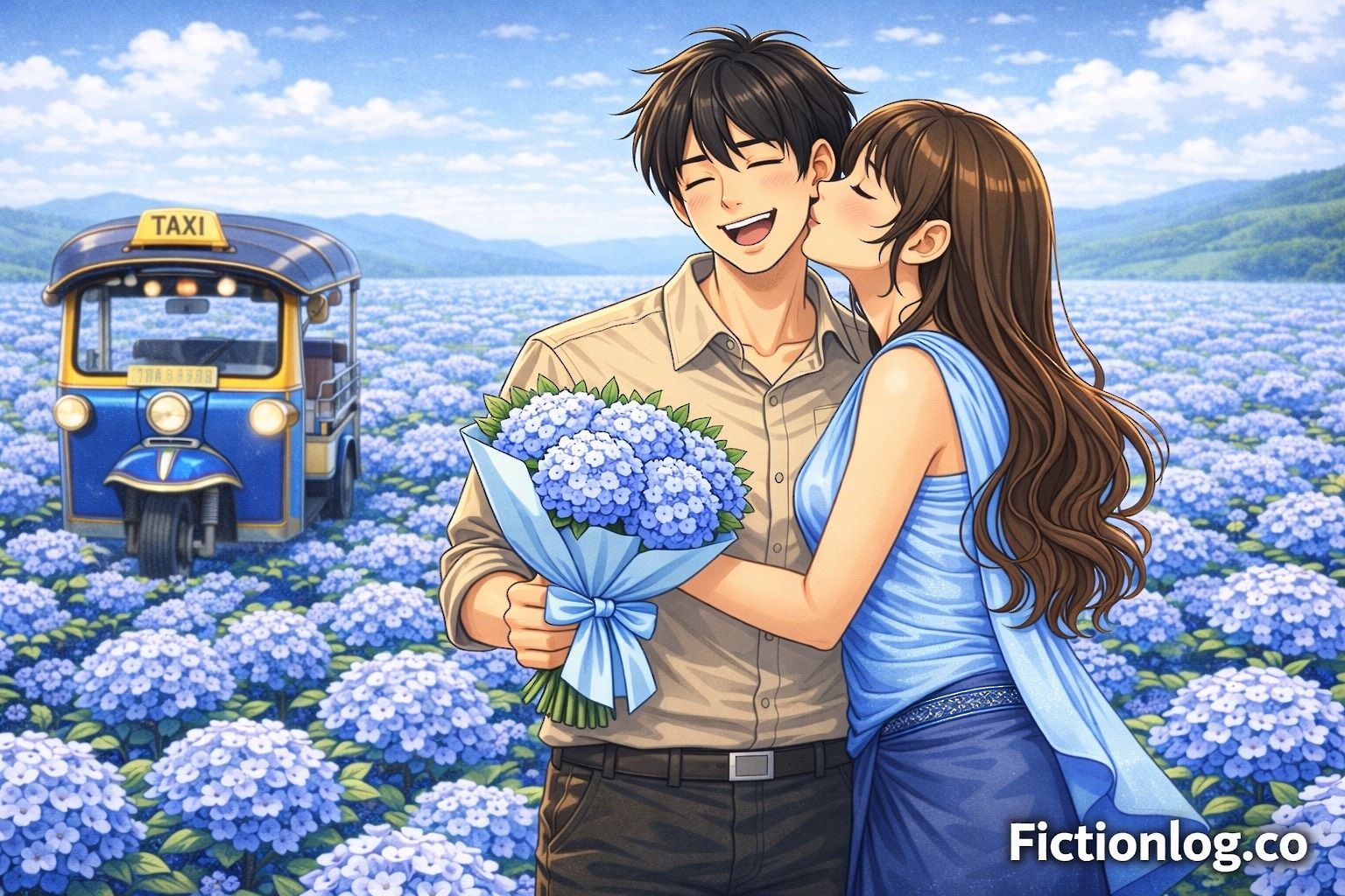 A standout visual element of this comic is the hydrangea flower, carefully chosen for its vibrant blue hues that bring a sense of freshness and liveliness to every scene. The cool, cheerful tone of blue hydrangeas creates a beautiful contrast against the warm, busy streets of Bangkok, making each panel feel both alive and dreamy. When paired with the love story of a tuk-tuk driver, the hydrangea adds a layer of tenderness and bloom — as if love itself is blossoming right there on the roadside, petal by petal, ride by ride.
