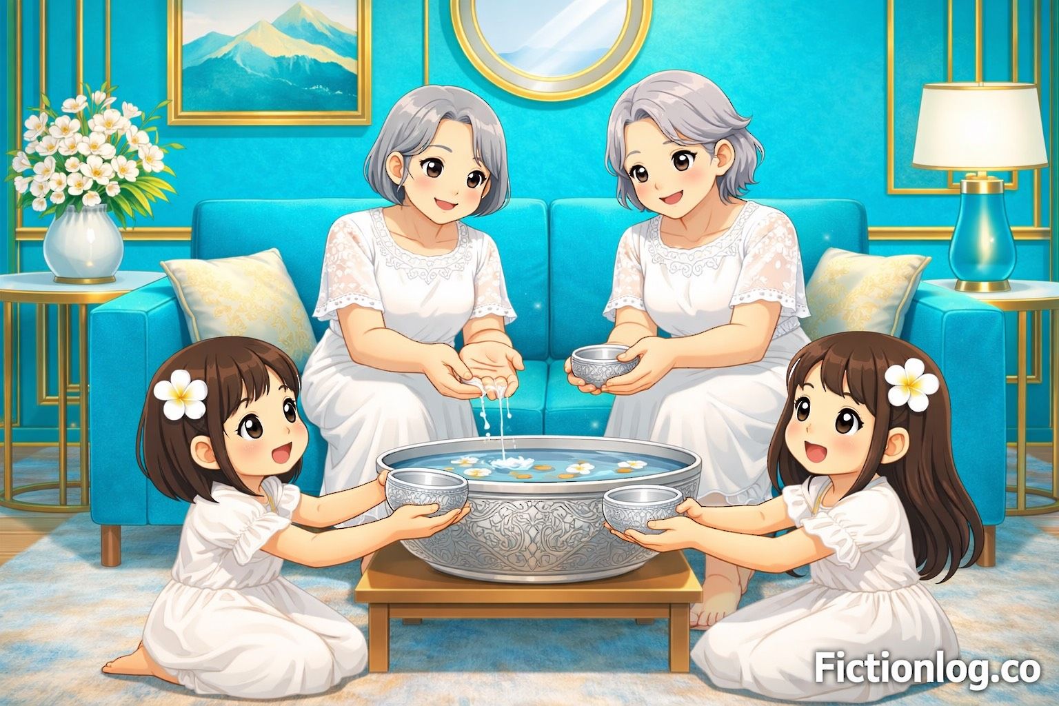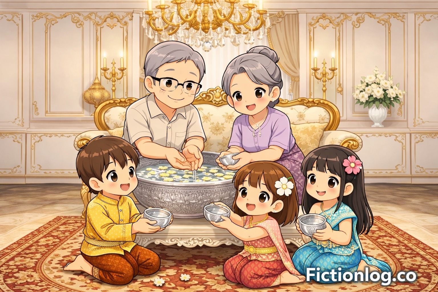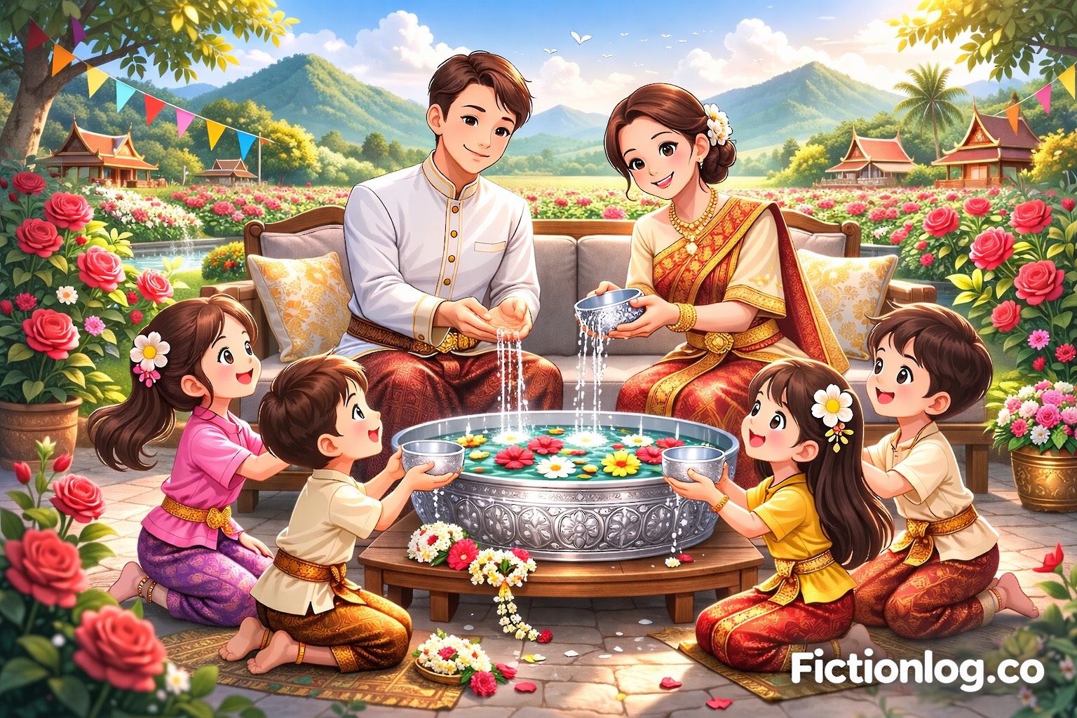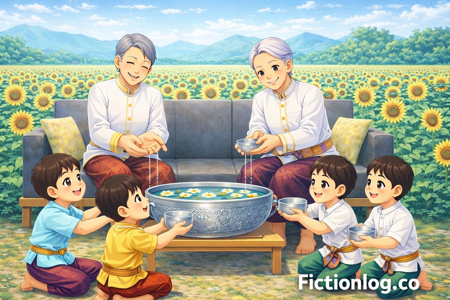 This comic captures a warm and quiet moment — children bowing with care as elders offer blessings from gentle hands. It reflects the humility that lives in Thai culture and the kindness of those who wish only good things for the ones they love. Through every drop of water and every soft blessing, this story celebrates not just a new year, but the steady love between generations — a love that, like Songkran water, keeps flowing on.